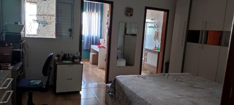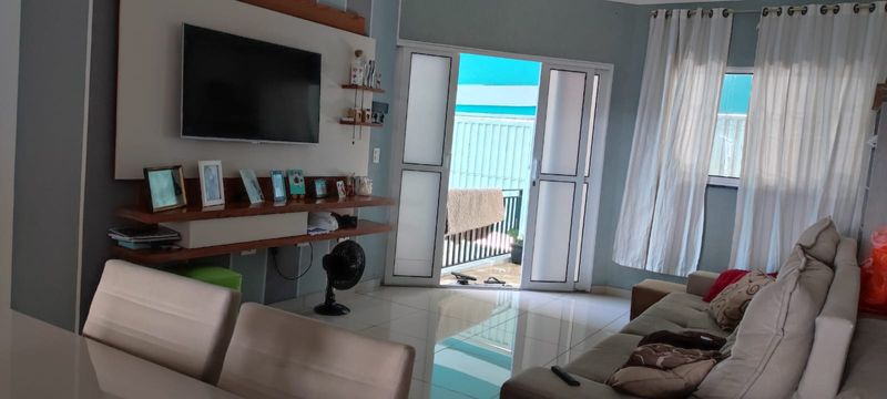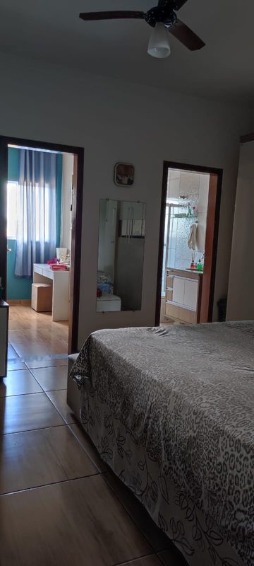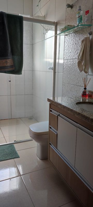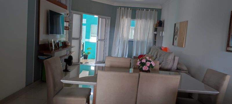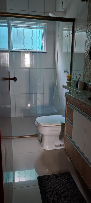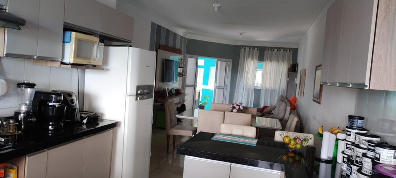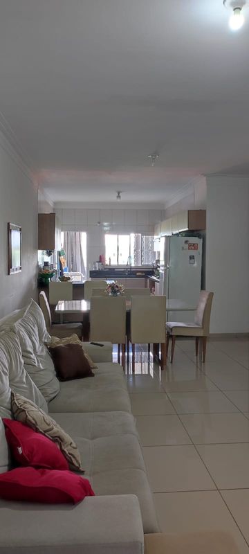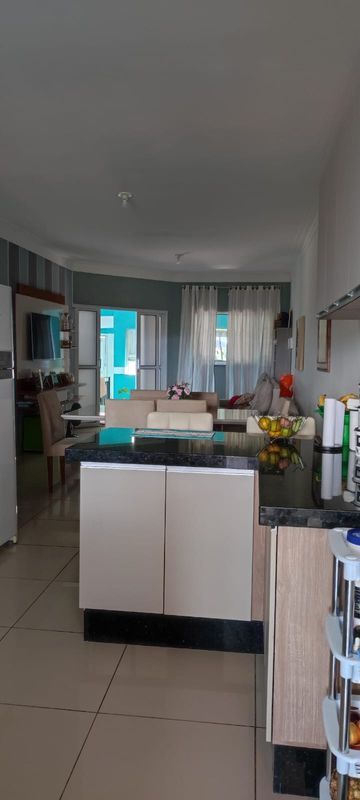 Casa com dois dormitórios sendo um suíte ,sala, copa, cozinha americana com armário, garagem coberta pra dois carros com portão automático, uma suíte em baixo, dispensa, toda com piso frio